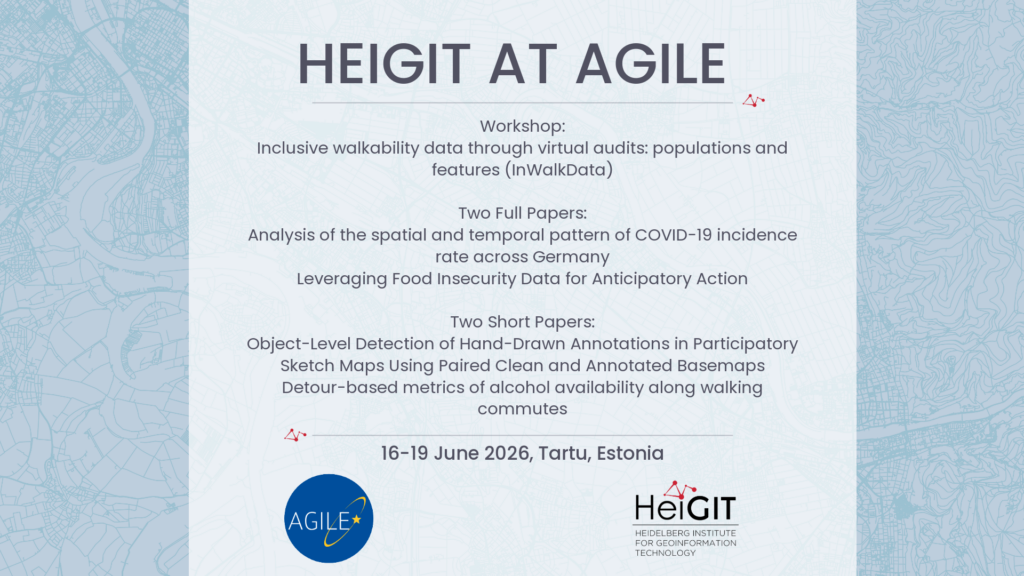 The AGILE Conference 2026 brings together experts in geographic information science to examine how spatial data and technology can help address important social issues. This year’s conference, from June 16 to June 19 in Tartu, Estonia, will cover health geography, participatory mapping, urban accessibility, and the use of data to guide decisions in humanitarian and policy work. HeiGIT will take part by offering a hands-on workshop on inclusive walkability with virtual audits, presenting two full papers on COVID-19 patterns in Germany and the use of food insecurity data for anticipatory action, and sharing two short papers on new methods in participatory sketch map analysis and measuring alcohol availability along walking routes.