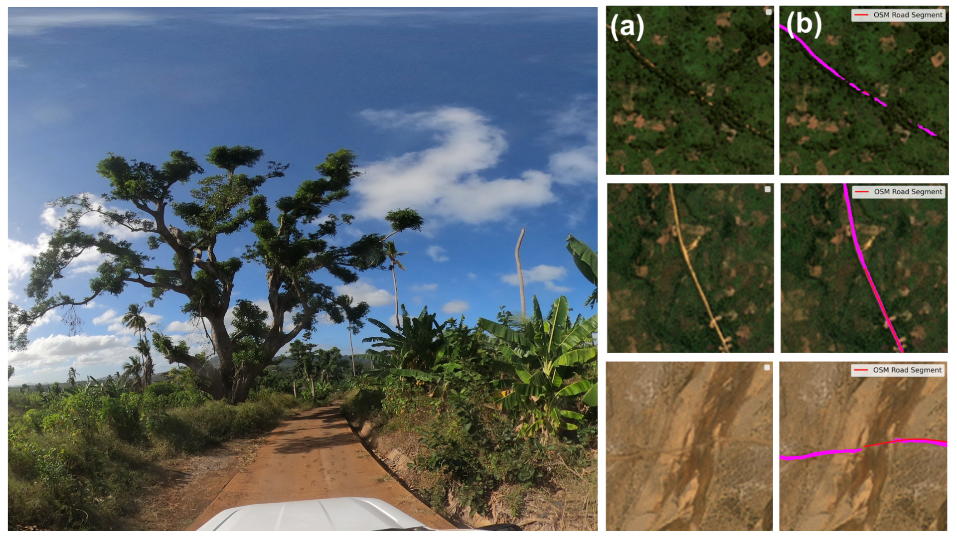 Bild rechts: © sig_3co, Panoramax; Die Abbildung links veranschaulicht den Arbeitsablauf und die Herausforderungen bei der Extraktion von Straßenattributen aus 3-4 m PlanetScope-Bildern.