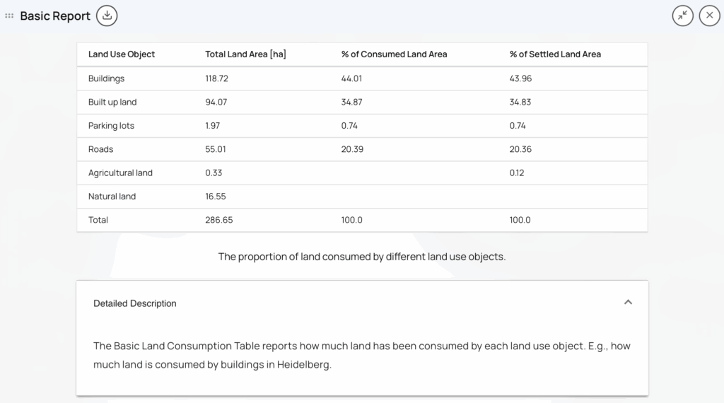 In der Basistabelle gibt Land Consumption die Gesamtfläche und den Anteil an der Gesamtfläche für jedes Landnutzungsobjekt (z.B. Gebäude, Straßen, Parkplätze) sowie den Anteil des Objekts an “verbrauchtem Land” und “besiedeltem Land” in dem jeweiligen Gebiet an.