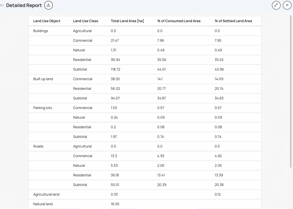 Die detaillierte Tabelle geht noch einen Schritt weiter und berechnet, wie viel Land für jedes Landnutzungsobjekt und jede Landnutzungsklasse (z.B. Gewerbe, Wohnen, Industrie) verbraucht und genutzt wird.