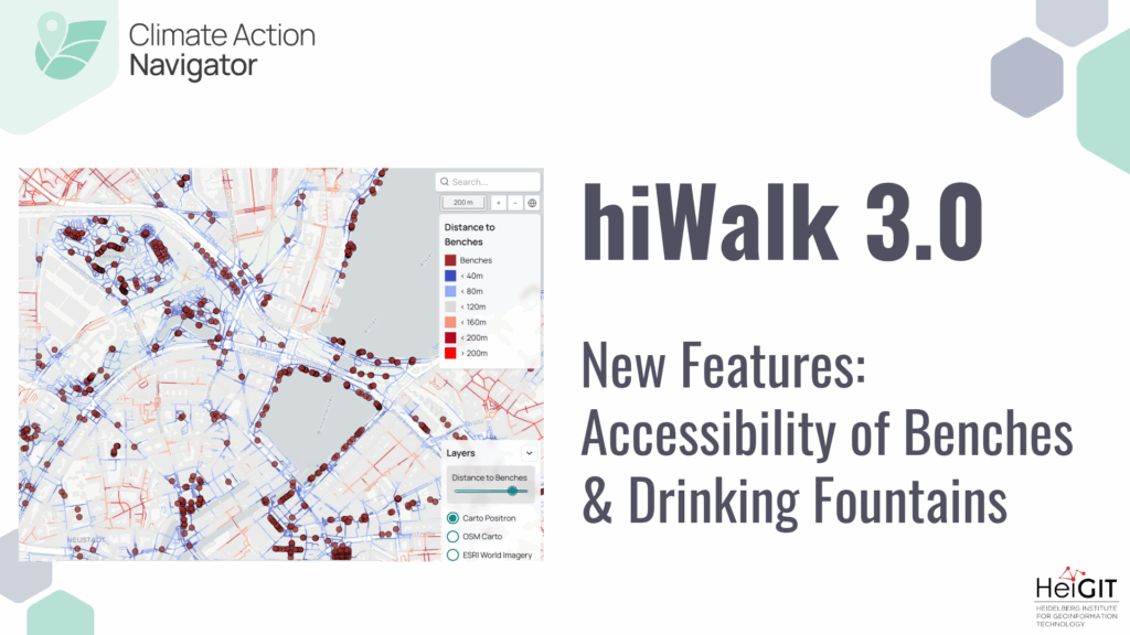 In the latest version, hiWalk introduces two new indicators that make walkability assessments even more comprehensive: Distance to Benches and Distance to Drinking Water Locations. The dashboard calculates actual walking distances to these points of interests, if there are fewer than 500. Otherwise straight line distances are used.