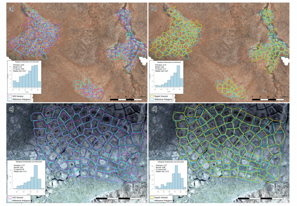 The study involved two case regions: Cape Blossom in Alaska and Blueberry Hills in Canada. 105 volunteer contributors participated in organized mapping events to map permafrost, The volunteers used an app to identify polygon centroids in high-resolution aerial imagery, part of which had previously been acquired with the help of local school students. The researchers then assessed the quality of volunteer contributions by comparing completeness and positional accuracy metrics against expert mappings. Using Voronoi diagrams, the study reconstructed ice-wedge polygon networks from the crowd-sourced centroid data, enabling the extraction of important geomorphological (e.g., polygon area, perimeter) and hydrological (e.g., network topology, betweenness centrality) parameters.